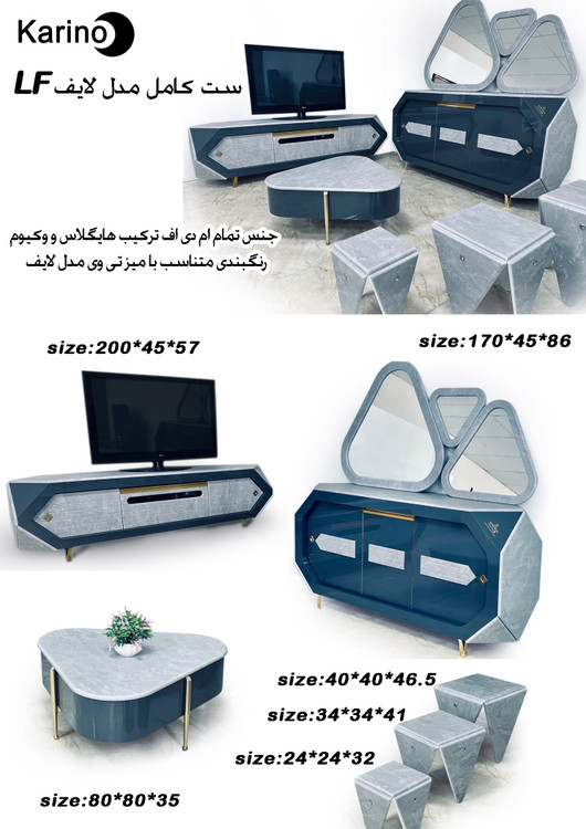 میز تلویزیون کارینو مدل لایف سایز ۲ متری، جنس تمام ام دی اف ترکیبی از هایگلاس و وکیوم، دارای ست کامل شانل آینه و کنسول و جلومبلی و عسلی، دارای رقص نور موزیکال بلوتوثی.