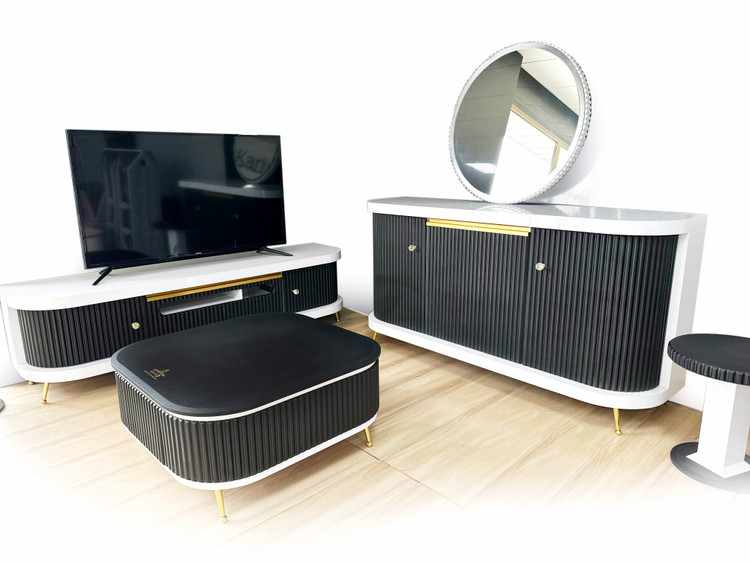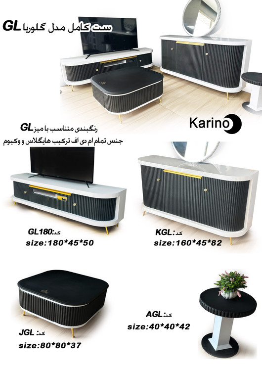 ست کامل آینه و کنسول مدل گلوریا برند کارینو، جنس تمام ام دی اف (ترکیبی از هایگلاس و وکیوم)، میز تی وی دارای رقص نور موزیکال.