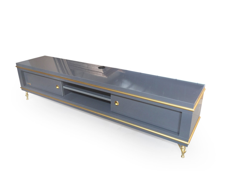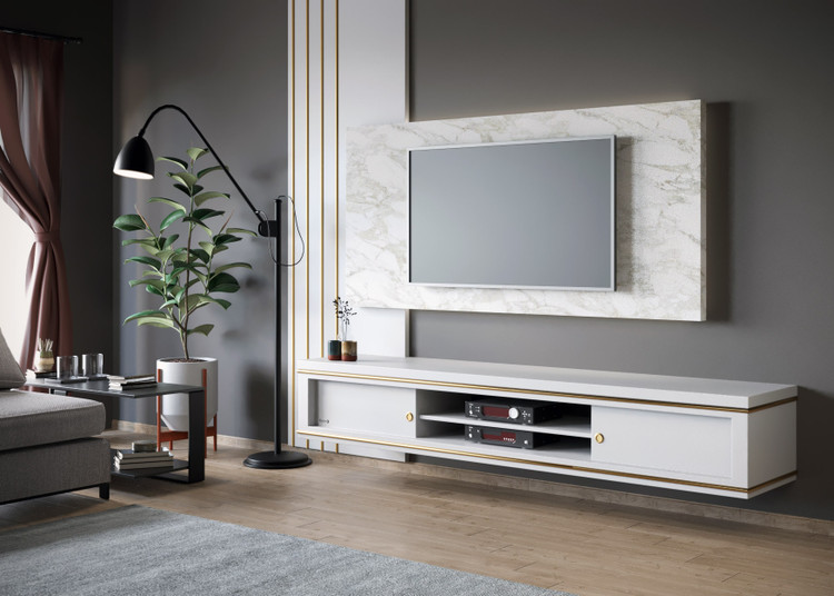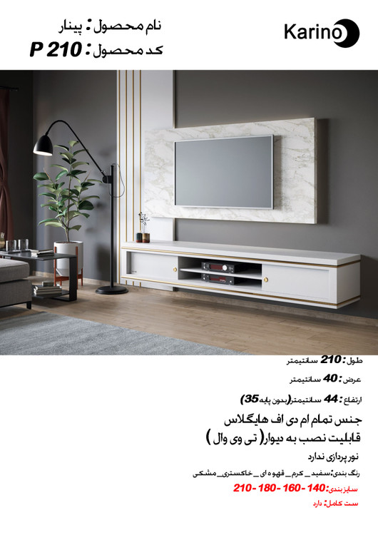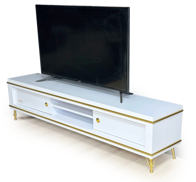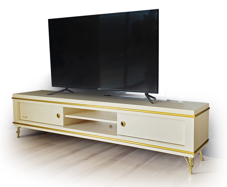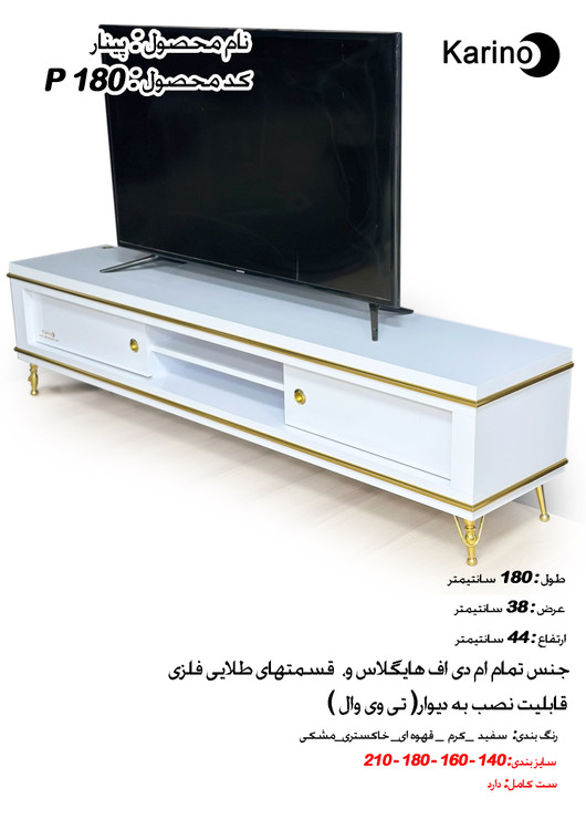 میز تلویزیون کارینو مدل پینار سایز ۱۸۰ و ۲۱۰، جنس هایگلاس، تمام قسمتهای طلایی از جنس فلز، قابلیت نصب به دیوار و استفاده در تی وی وال.